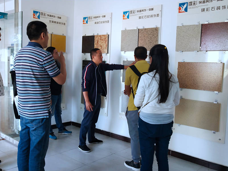 客户表示:之前一直都是做传统保温,常用的是EPS/XPS薄抹灰工艺,但是传统保温一直有弊端,上墙不到几年,一是容易起层脱落、开裂,二是表面的装饰层容易起皮变色。所以在寻求新型的材料,近期在关注保温装饰一体板,“佳和星”品牌也是经常听说,今天团队专门来到佳和星考察,想了解一体板的各种工艺和安装。