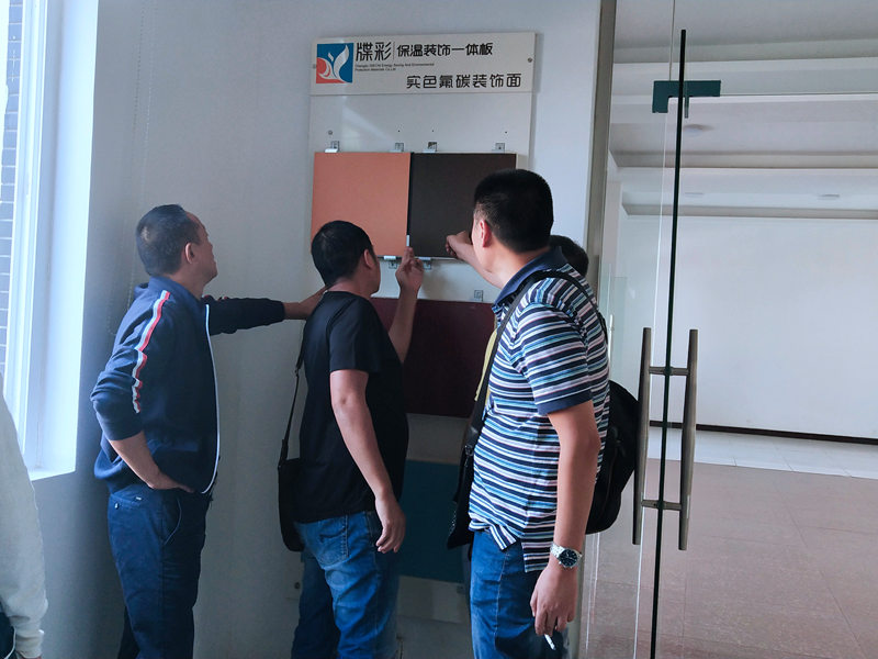 客户表示:之前一直都是做传统保温,常用的是EPS/XPS薄抹灰工艺,但是传统保温一直有弊端,上墙不到几年,一是容易起层脱落、开裂,二是表面的装饰层容易起皮变色。所以在寻求新型的材料,近期在关注保温装饰一体板,“佳和星”品牌也是经常听说,今天团队专门来到佳和星考察,想了解一体板的各种工艺和安装。